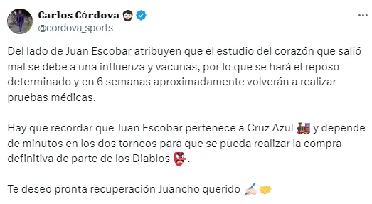 De esta manera, Juan Escobar no solo encendió las alarmas de Toluca, sino también de Cruz Azul. Y es que, más allá de la preocupación que generó en ambas aficiones y los mensajes de apoyo que recibió por su estado de salud, en el tema deportivo también impactaría en La Noria.