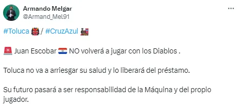 “Juan Escobar NO volverá a jugar con los Diablos. Toluca no va a arriesgar su salud y lo liberará del préstamo. Su futuro pasará a ser responsabilidad de la Máquina y del propio jugador”, reportó el periodista en las últimas horas, a través de su cuenta de X.