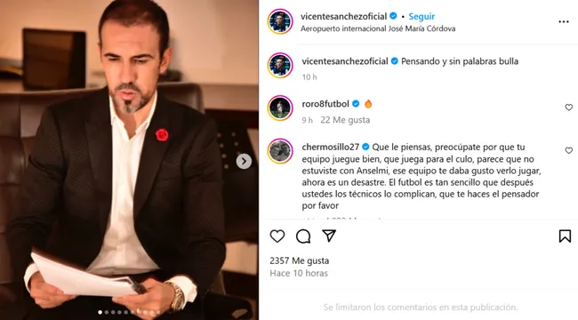 “Pensando y sin palabras bulla”, escribió el entrenador uruguayo, acompañado de una serie de postales en las que se le ve leyendo unas hojas que tiene en la mano. Sin embargo, ante los ataques que no cesaban en su contra, optó por desactivar los comentarios de su posteo.