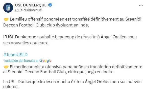 “El mediocampista ofensivo panameño es transferido definitivamente al Sreenidi Deccan Football Club, club que juega en India. La USL Dunkerque le desea mucho éxito a Ángel Orelien con sus nuevos colores”, publicó el equipo francés acerca del jugador juvenil.