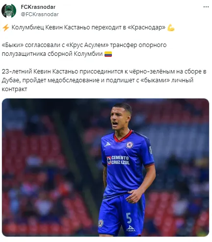 “El colombiano Kevin Castaño se muda a Krasnodar. Los Toros acordaron con Cruz Azul el traspaso del mediocampista defensivo de la Selección de Colombia. Kevin Castaño, de 23 años, se unirá a los verdinegros en el campo de entrenamiento de Dubai, se someterá a un reconocimiento médico y firmará un contrato con los Toros“, fue el mensaje del equipo ruso para confirmar la llegada de Castaño.
