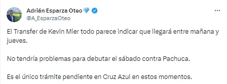 “El transfer de Kevin Mier todo parece indicar que llegará entre mañana y jueves. No tendría problemas para debutar el sábado contra Pachuca. Es el único trámite pendiente en Cruz Azul en estos momentos”, publicó a través de su cuenta de Twitter.