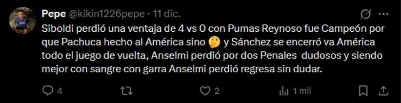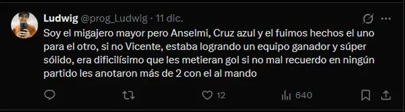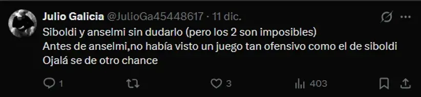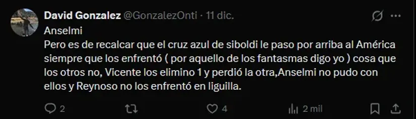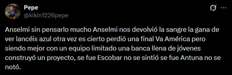 “Anselmi sin pensarlo mucho Anselmi nos devolvió la sangre la gana de ver lancéis azul otra vez es cierto perdió una final Va América pero siendo mejor con un equipo limitado una banca llena de jóvenes construyó un proyecto, se fue Escobar no se sintió se fue Antuna no se notó“, es uno de los comentarios con más reacciones, evidenciando la aceptación hacia el argentino.