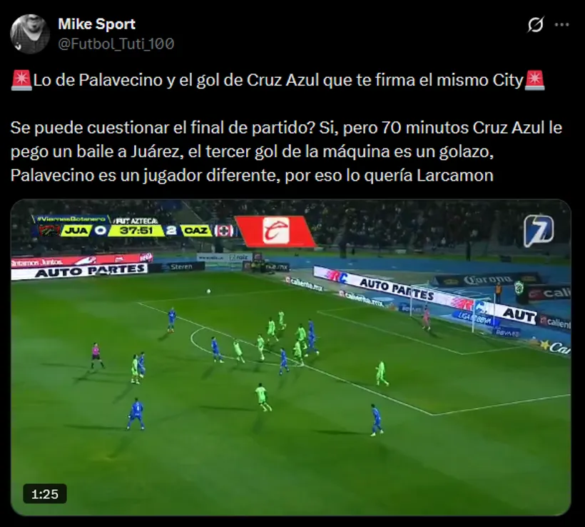 “Lo de Palavecino y el gol de Cruz Azul que te firma el mismo City. Se puede cuestionar el final de partido? Si, pero 70 minutos Cruz Azul le pego un baile a Juárez, el tercer gol de la máquina es un golazo, Palavecino es un jugador diferente, por eso lo quería Larcamón”, indicó ‘Mike Sport’.