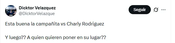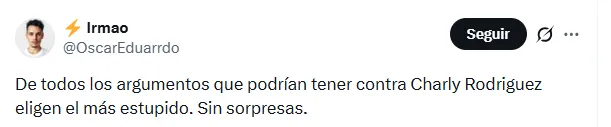 La sensación de una crítica desmedida también apareció en otros mensajes. “Está buena la campañita vs Charly Rodríguez. ¿Y luego? ¿A quién quieren poner en su lugar?”, cuestionó otro usuario, poniendo sobre la mesa la falta de alternativas claras en la misma posición.