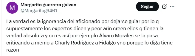 Incluso hubo quienes fueron más allá, apuntando directamente contra el discurso mediático. “Otra campaña más contra Charly Rodríguez… de todos los argumentos que podrían tener eligen el más estúpido”, señalaron. Y en la misma línea, otro comentario reflejó el hartazgo: “La ignorancia del aficionado por dejarse guiar por lo que supuestamente los expertos dicen… no porque lo diga alguien como Álvaro Morales tiene razón”.