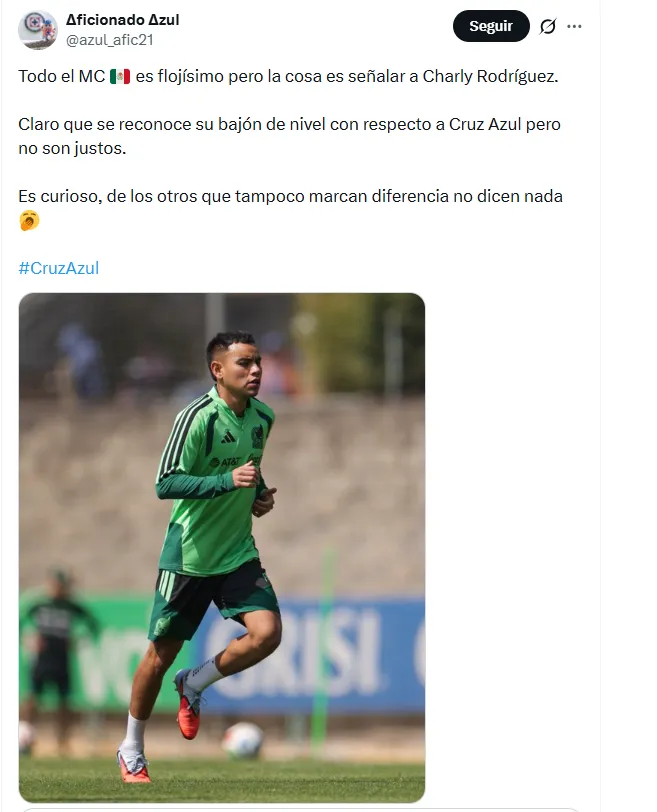 “Todo el mediocampo de México es flojísimo, pero la cosa es señalar a Charly Rodríguez. Claro que se reconoce su bajón de nivel con respecto a Cruz Azul, pero no son justos”, expresó un aficionado.