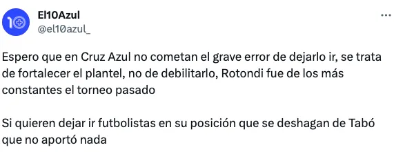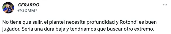 “Ni se les ocurra vender a Rotondi, sería un tremendo error“; “No tiene que salir, el plantel necesita profundidad”; “Se trata de fortalecer el plantel, no de debilitarlo“, son algunos de los comentarios que se leen en Twitter.