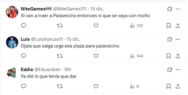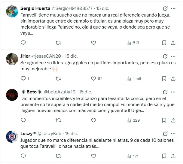 “Faravelli tiene muuuucho que no marca una real diferencia cuando juega… es una plaza muy mejorable si llega Palavecino, ojalá que se vaya”, escribió un fanático, mientras que otro añadió: “Jugador que no marca diferencia ni adelante ni atrás, 9 de cada 10 balones que toca los hace hacia atrás…”.