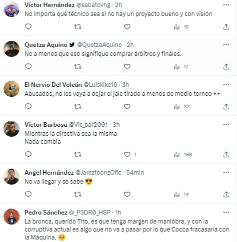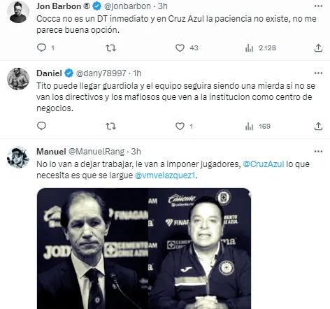 Mientras que otro sector se resignó a que la directiva perjudicaría a cualquier estratega que llegue, ya sea por la falta de proyecto como por la imposición de jugadores. “Puede llegar Guardiola y el equipo seguirá siendo una mie*** si no se van los directivos y los mafiosos que ven a la institución como centro de negocios”, disparó un aficionado. Otro sumó: “No lo van a dejar trabajar, le van a imponer jugadores, Cruz Azul lo que necesita es que se largue Víctor Velázquez”.