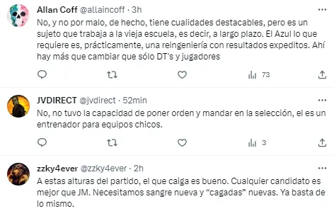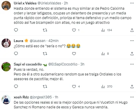 Por su parte se mostró a favor de su llegada teniendo en cuenta las opciones disponibles. “Pues la verdad, no, pero de él a otro sudamericano random que se traiga Ordiales o los asesores de pacotilla; mejor él”, lanzó un fanático. “De las opciones reales sí es la mejor opción porque ni Vucetich, ni Hugo Sánchez, ni Romano, nadie de esos ni Gareca, nunca vendrían”, fue otro de los Tweets.