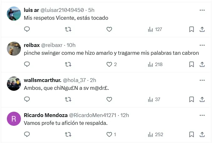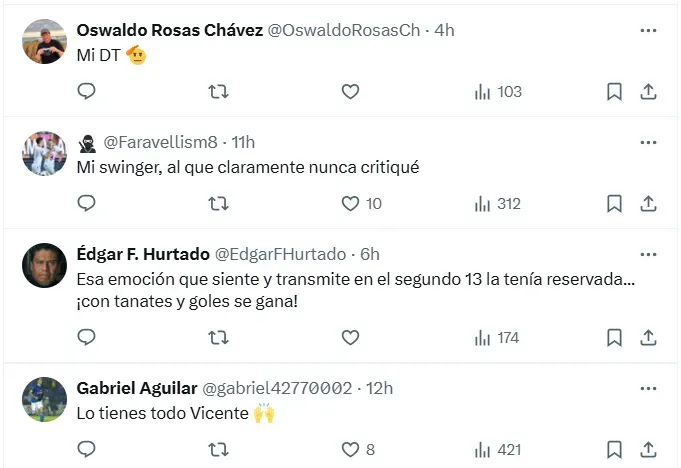 Las redes sociales estallaron minutos después. Aficionados dejaron sus mensajes de apoyo y pedido unánime: que Vicente continúe en el banquillo celeste para el Torneo Apertura 2025. “Lo tienes todo Vicente”, “Mi DT”, “Mis respetos, Vicente, estás tocado”, “Vamos profe, tu afición te respalda”, fueron algunos de los comentarios más repetidos. Incluso aquellos que lo habían cuestionado al inicio se rindieron a sus pies: “Cómo me hizo amarlo y tragarme mis palabras tan cabrón”, escribió un aficionado en X.