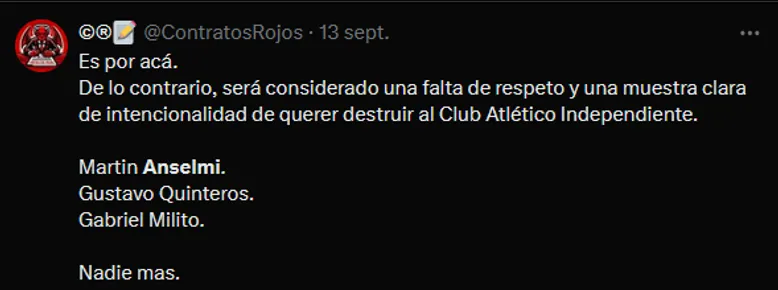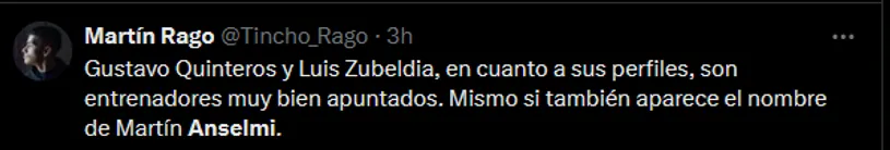Esto lo hicieron a través de la red social X (ex Twitter), a partir de la típica danza de nombres que comenzó a sonar. Si bien Luis Zubeldía y Gustavo Quinteros son hoy por hoy los que más cerca están por gusto de la directiva, la parcialidad del Rojo tiene otros planes en mente para su propio banquillo.