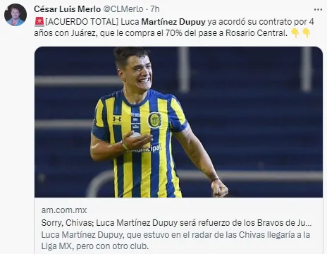 Según información del periodista César Luis Merlo para Súper Deportivo, Luca Martínez Dupuy acordó su llegada a FC Juárez para este mismo Apertura 2023. Los fronterizos le comparán el 70 por ciento del pase y firmará por cuatro años. ¿Jugará algún día con La Máquina?