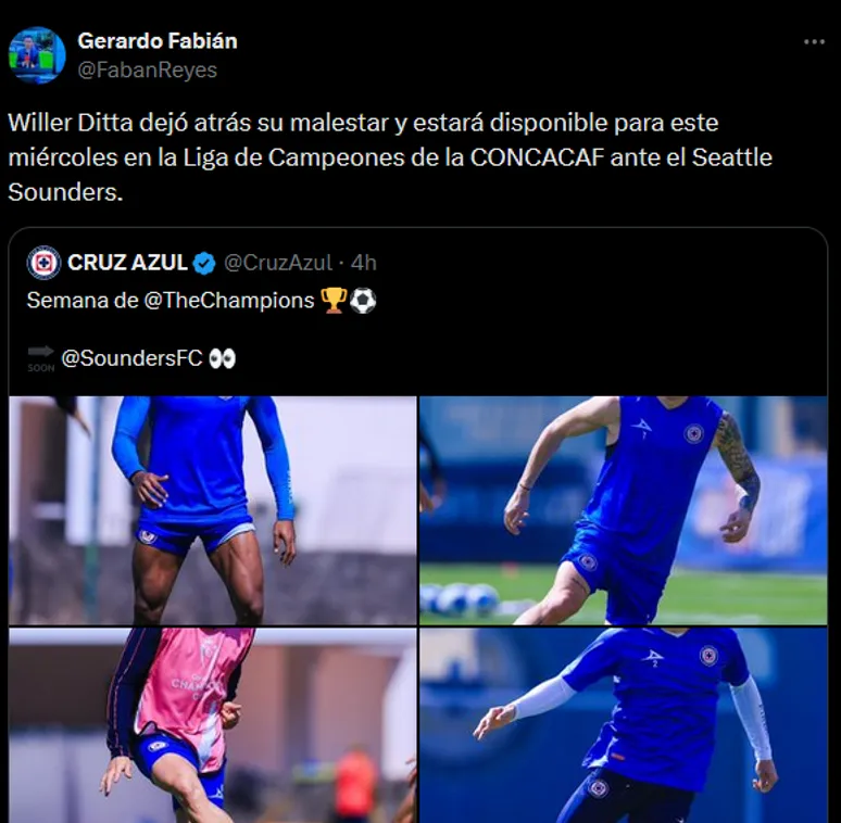 Así lo dio a conocer el periodista Gerardo Fabián Reyes en su cuenta de X, sorprendiendo a los aficionados celestes. “Willer Ditta dejó atrás su malestar y estará disponible para este miércoles en la Liga de Campeones de la CONCACAF ante el Seattle Sounders”, expresó contundente.