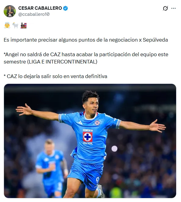 “Es importante precisar algunos puntos de la negociación por Sepúlveda. Ángel no saldrá de Cruz Azul hasta acabar la participación del equipo este semestre. Cruz Azul lo dejaría salir sólo en venta definitiva”, explicó Caballero en redes sociales, describiendo el escenario con exactitud.