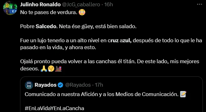 Esta noticia tampoco fue indiferente para el público cruzazulino, quien guarda un gran recuerdo de los últimos tiempos de Salcedo. Pues el jugador de 31 años fue titular indiscutido en el equipo celeste que le cambió la cara a los últimos tiempos de la institución y llegó hasta la final del Clausura 2024.