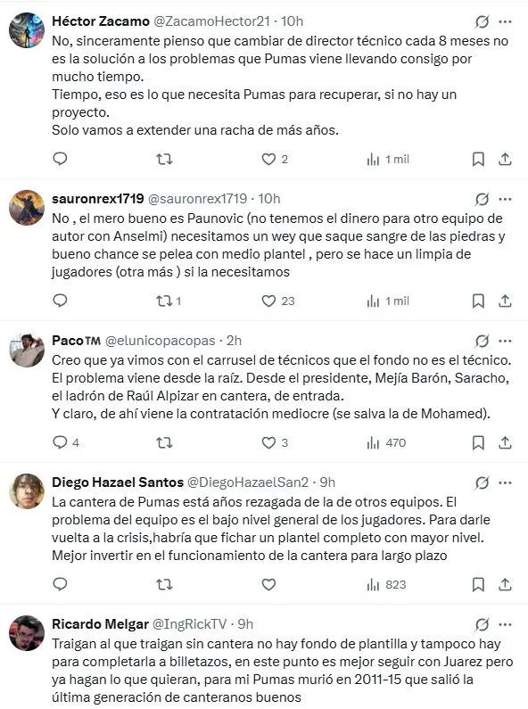 La realidad es que el clima en Pumas no es para bueno considerando que está quedando fuera hasta del Play-in. Ante esta situación, en redes sociales no se ha mostrado aprobación con la posible llegada de Martín Anselmi. Además, Efraín Juárez es un entrenador que está muy identificado con la institución, por lo que la afición continúa confiando en él.