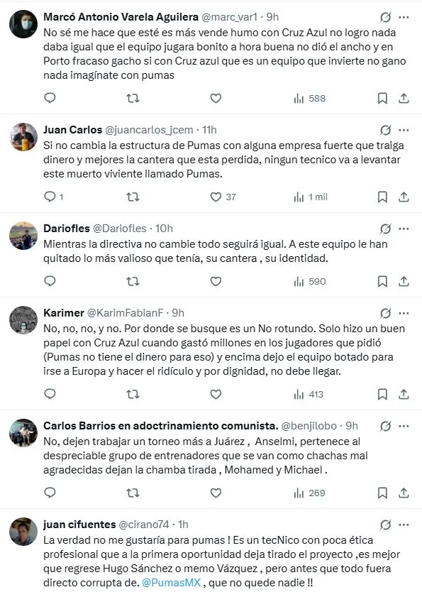 El argentino mostró poco compromiso con Cruz Azul y no tiene ninguna relación con el Auriazul, por lo que genera dudas. Asimismo, en los comentarios se puede observar cómo la afición apunta contra la estructura del club y la política para manejar el futbol. Por supuesto, contratar a Anselmi lleva consigo una inversión muy importante de dinero; luego de su paso por Europa y de ser de los mejores pagados de la Liga MX, solo llegaría a CU por una oferta potente.
