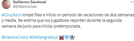 Según información de nuestro reportero Guillermo Sandoval, Martín Anselmi dispuso que el plantel de Cruz Azul rompa filas e inicie un periodo de vacaciones de aproximadamente dos semanas y media. Será hasta el lunes 10 de junio que el equipo regrese a los entrenamientos de cara a la Leagues Cup y la próxima Liga MX.