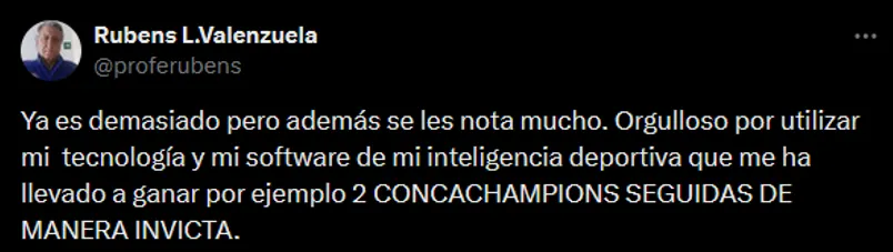 Esto pareciera que no le gustó nada al PF, quien contestó rápido. “Ya es demasiado pero además se les nota mucho. Orgulloso por utilizar mi tecnología y mi software de mi inteligencia deportiva que me ha llevado a ganar por ejemplo 2 CONCACHAMPIONS SEGUIDAS DE MANERA INVICTA“, fue su contundente respuesta tras el posteo del mencionado reportero.