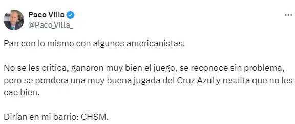 “Pan con lo mismo con algunos americanistas. No se les critica, ganaron muy bien el juego, se reconoce sin problema, pero se pondera una muy buena jugada del Cruz Azul y resulta que no les cae bien. Dirían en mi barrio: CHSM”, respondió Paco Villa.