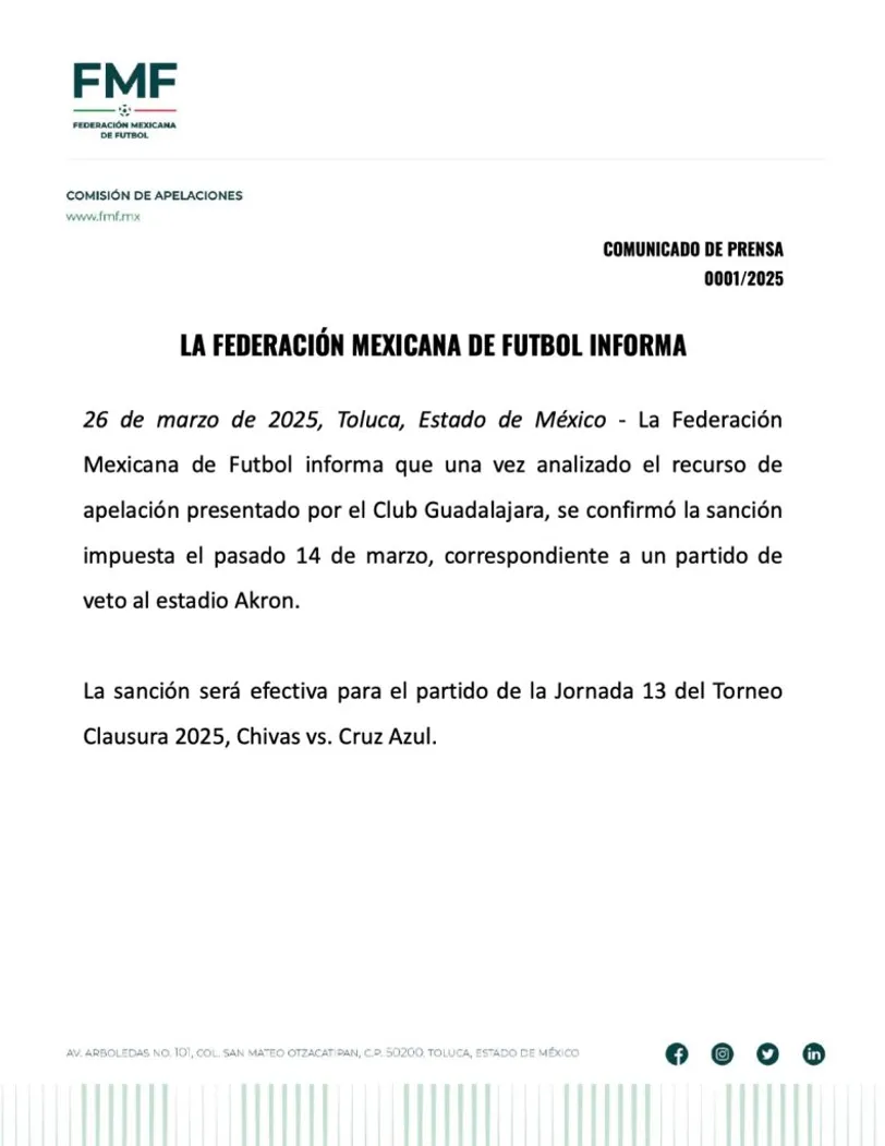 Sin embargo, este miércoles se pronunció al respecto ratificando lo antes dicho. “La Federación Mexicana de Futbol informa que una vez analizado el recurso de apelación presentado por el Club Guadalajara, se confirmó la sanción impuesta el pasado 14 de marzo, correspondiente a un partido de veto al estadio Akron. La sanción será efectiva para el partido de la Jornada 13 del Torneo Clausura 2025, Chivas vs. Cruz Azul“.
