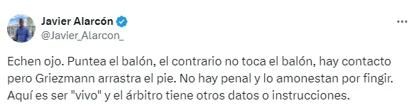 “Echen ojo. Puntea el balón, el contrario no toca el balón, hay contacto, pero Griezmann arrastra el pie. No hay penal y lo amonestan por fingir. Aquí es ser “vivo” y el árbitro tiene otros datos o instrucciones“, insistió Javier Alarcón respecto a la determinación del Gato Ortiz.