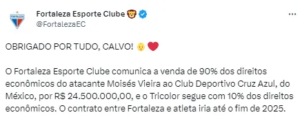 “Fortaleza Esporte Clube anuncia la venta del 90% de los derechos económicos del delantero Moisés Vieira al Club Deportivo Cruz Azul, de México, por R$ 24.500.000,00, y Tricolor continúa con el 10% de los derechos económicos. El contrato entre Fortaleza y el atleta se extendería hasta fines de 2025“, anunció el club brasileño en los últimos minutos.