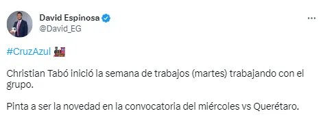 Se trata de Christian Tabó, quien ya entrenó a partir de esta semana al parejo del equipo, por lo que podría aprovechar la pausa que tendrá la Liga MX este fin de semana, debido a la Fecha FIFA, para terminar de adaptarse al ritmo del entrenador cementero y ser la gran novedad en la convocatoria del partido de la próxima semana, frente a los Gallos.