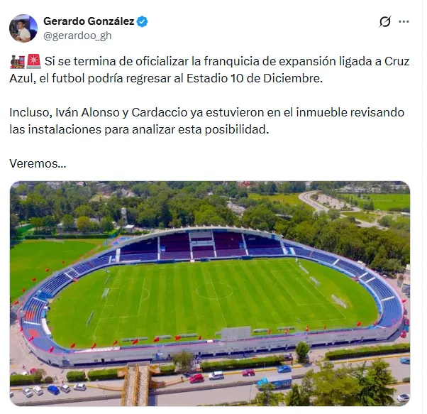 “Si se termina de oficializar la franquicia de Expansión ligada a Cruz Azul, el futbol podría regresar al Estadio 10 de Diciembre. Incluso, Iván Alonso y Cardaccio ya estuvieron en el inmueble revisando las instalaciones para analizar esta posibilidad”, escribió en X.