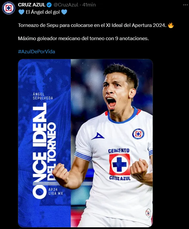 Luego de dos días y medio sin actividad, la cuenta oficial de Cruz Azul “reaccionó” para compartir un posteo de Ángel Sepúlveda. Y es que el Cuate fue incluído en la alineación ideal de la Liga MX en este Apertura, en la cual no se incluyó a Martín Anselmi como el mejor DT. “El Ángel del gol. Torneazo de Sepu para colocarse en el XI Ideal del Apertura 2024. Máximo goleador mexicano del torneo con 9 anotaciones”, destacaron junto a una imagen del atacante.