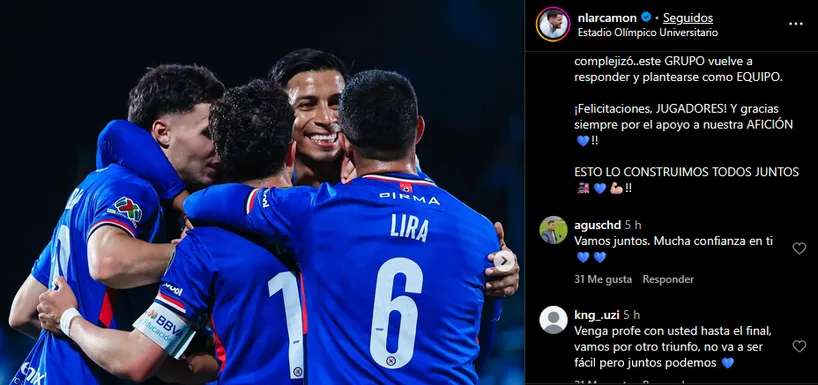 Pero algunas horas más tarde, el ex Necaxa habló en sus redes sociales: “Otro triunfo que nos impulsa a seguir construyendo lo que todos queremos Cruz Azul!! Seguir sumando es clave para mantenernos en lo más alto y al mismo tiempo seguir ajustando y mejorando en la búsqueda de nuestra mejor versión”, prometió en esa segunda parte.