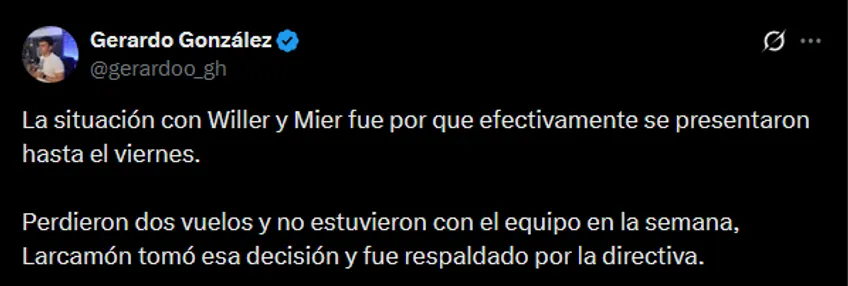 Tiempo más tarde de ello, nuestro insider agregó: “La situación con Willer (Ditta) y (Kevin) Mier fue por que efectivamente se presentaron hasta el viernes. Perdieron dos vuelos y no estuvieron con el equipo en la semana, Larcamón tomó esa decisión y fue respaldado por la directiva”.