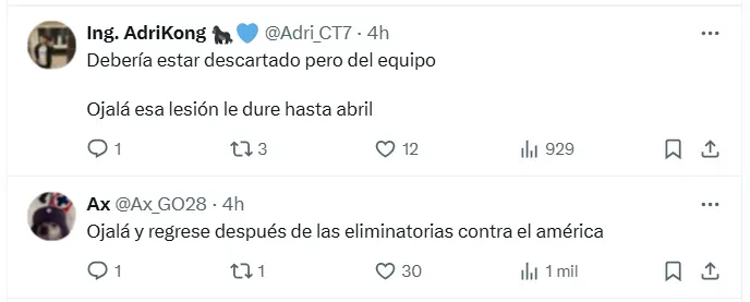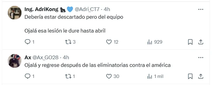 Pero, más allá de las evidentes interrogantes sobre quién estará en su lugar, muchos aficionados apuntaron a Rodolfo Rotondi y sus últimas actuaciones ante el América para lanzarle dardos al futbolista. “Debería estar descartado, pero del equipo. Ojalá esa lesión le dure hasta abril“, fue uno de los comentarios más contundentes al respecto.