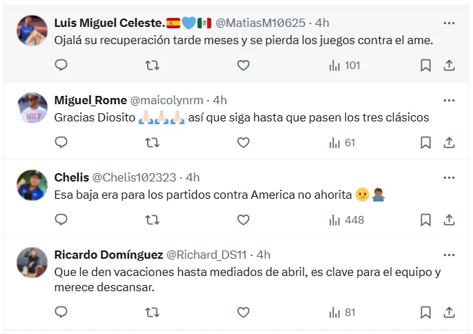 “Ojalá siga así hasta después de los 3 clásicos“, posteó otro fanático haciendo alusión a la trilogía de clásicos que habrá en los próximos días con el duelo por la Liga MX y los cuartos de final de la Concachampions. Esto pone de relieve aún no le han perdonado sus actuaciones en las eliminaciones frente al América, tanto en el Clausura como el Apertura 2024.