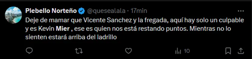 “Me quedo con la reacción del segundo tiempo y que la máquina no perdió ni con la peor noche de la carrera de Kevin Mier! A seguir mejorando!”, escribió el ex delantero en sus redes sociales después del partido que se jugó en el Estadio Jalisco, en donde fue el más flojo del campo de juego.