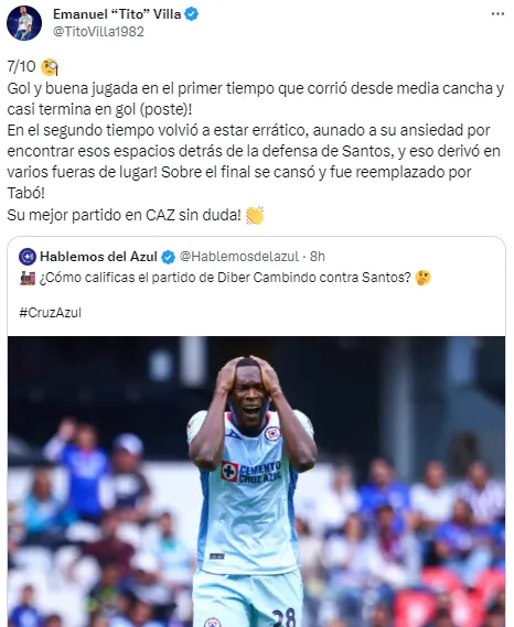 “7/10. Gol y buena jugada en el primer tiempo que corrió desde media cancha y casi termina en gol (poste)! En el segundo tiempo volvió a estar errático, aunado a su ansiedad por encontrar esos espacios detrás de la defensa de Santos, y eso derivó en varios fueras de lugar! Sobre el final se cansó y fue reemplazado por Tabó! Su mejor partido en CAZ sin duda!“, escribió el exjugador cruzazulino y actual miembro de TUDN.