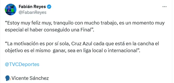 “Estoy muy feliz y muy tranquilo, con mucho trabajo. Es un momento muy especial el haber conseguido una Final internacional para el club”, señaló en relación con sus sensaciones de cara a lo que será probablemente su último partido. Allí, agregó también que “la motivación es por sí sola. En Cruz Azul, cada vez que está en la cancha el objetivo es el mismo: ganar, sea en liga local o internacional”.