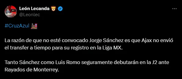El caso de Jorge Sánchez fue completamente diferente. Si bien se estimaba que al menos podría ocupar un lugar en el banquillo de los suplentes, el lateral no estuvo porque Ajax todavía no envió el pertinente transfer que lo habilita a jugar. Esto fue expresado por León Lecanda en sus redes sociales, llamando la atención de propios y extraños.