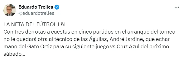 “Con tres derrotas a cuestas en cinco partidos en el arranque del torneo, no le quedará otra al técnico de las Águilas, André Jardine, que echar mano del Gato Ortiz para su siguiente juego vs. Cruz Azul del próximo sábado”, escribió el comentarista en su cuenta de X.