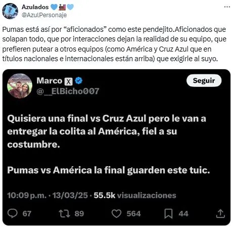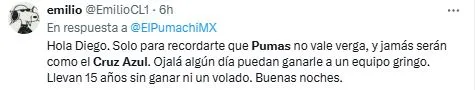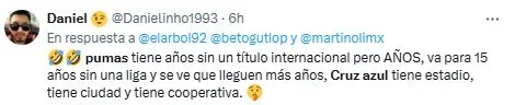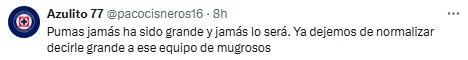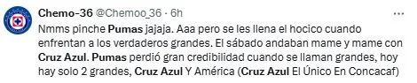 “Pumas está así por “aficionados” que solapan todo, que por interacciones dejan la realidad de su equipo, que prefieren insultar a otros equipos que exigirle al suyo”, fue uno de los mensajes del público cementero que más repercusión ganó. Por supuesto, en Cruz Azul hay una confianza absoluta después de las últimas victorias que se han cosechado.