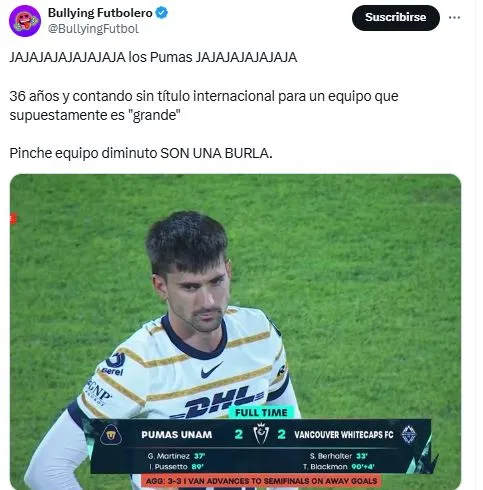 Ante este contexto, la afición cementera comenzó a realizar una serie de burlas tras la derrota de Pumas. Sobre todo porque en las últimas horas se había especulado muy fuerte con tener una final con solo conjuntos mexicanos. Mientras que La Máquina se enfrentará a Tigres por un boleto en dicha instancia, el Club Universidad Nacional deberá ver la definición desde lejos.