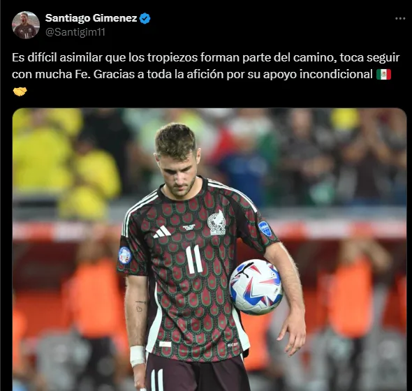Santi Giménez hasta ahora se había mantenido en silencio tras el papelón del Tri, pero en las últimas horas decidió subir a sus redes sociales un sentido mensaje al respecto: “Es difícil asimilar que los tropiezos forman parte del camino, toca seguir con mucha Fe. Gracias a toda la afición por su apoyo incondicional“, expresó el ex cementero, acompañando dichas palabras con un emoji de la bandera mexicana y otro de apretón de manos.