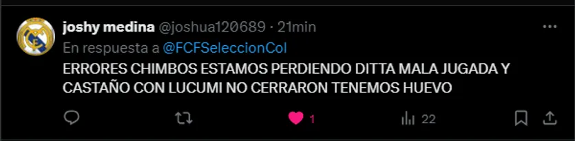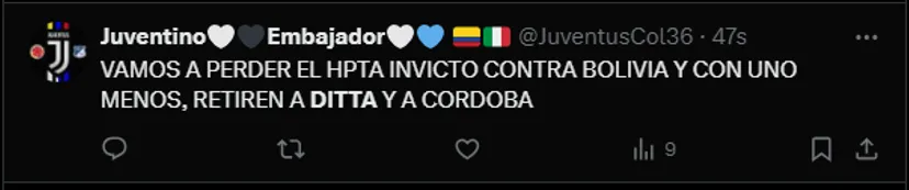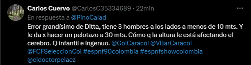 Si bien no parece ser culpa de Ditta el gol de Bolivia, por alguna razón los aficionados colombianos se desquitaron con él. “Error grandísimo de Ditta”, “Mala jugada de Ditta” y una serie de memes se hicieron virales. Conociendo como lo conocemos desde aquí, no caben dudas de que podrá salir adelante.