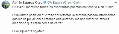 Como contrapartida al difícil panorama planteado por uno de los reporteros, Adrián Esparza Oteo, miembro de TUDN, disparó: “Cruz Azul mantiene todas las esperanzas puestas en fichar a Alan Pulido. Es la última posición que falta por reforzar, la semana pasada informamos que las negociaciones estaban adelantadas, incluso Victor Velázquez mencionó que están cerca de cerrar. Es el siguiente objetivo”.