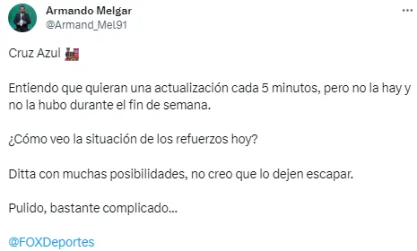 “Pulido, bastante complicado”, afirma en su cuenta de Twitter el periodista cercano a Cruz Azul, Armando Melgar, en un contexto donde el centroatacante continúa anotando goles y dándole motivos a los de la MLS para querer retenerlo.