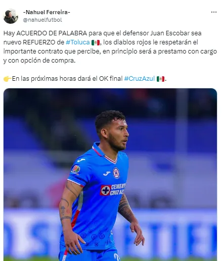 “Hay ACUERDO DE PALABRA para que el defensor Juan Escobar sea nuevo REFUERZO de Toluca, los diablos rojos le respetarán el importante contrato que percibe, en principio será a préstamo con cargo y con opción de compra. En las próximas horas dará el OK final”, escribió el peiodista.