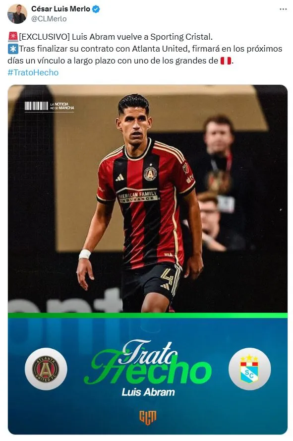 La realidad es que el defensa de 29 años terminó desarrollándose en la MLS hasta la última temporada, en donde se le terminó su contrato en Atlanta United. En medio de la incertidumbre con su futuro, César Luis Merlo confirmó que Luis Abram será nuevo jugador de Sporting Cristal. El futbolista regresará al club de sus amores a 7 años de su salida.