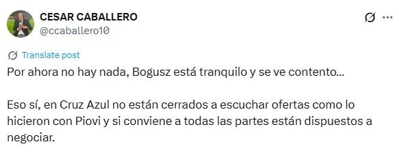 Pese a ese gran cambio de su situación, Bogusz mantendría una postura tranquila y profesional dentro del club. Según expresó el reportero César Caballero en X: “está tranquilo y se ve contento“. Dicha declaración se dio en el contexto de los rumores que sitúan al polaco como interés de un equipo de Alemania.